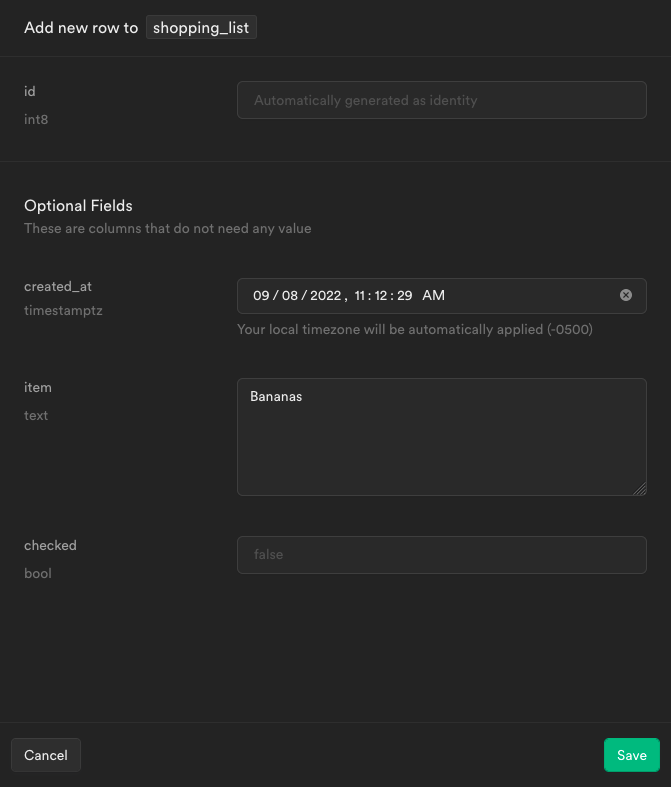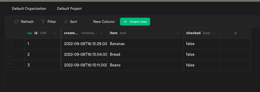 shopping_list. The table has anitemcolumn withtextcontent along with acheckedcolumn withboolcontent and a default value offalse. This is in addition to the default columnsidandcreated_at.When your screen looks like the screenshot below, click Save.